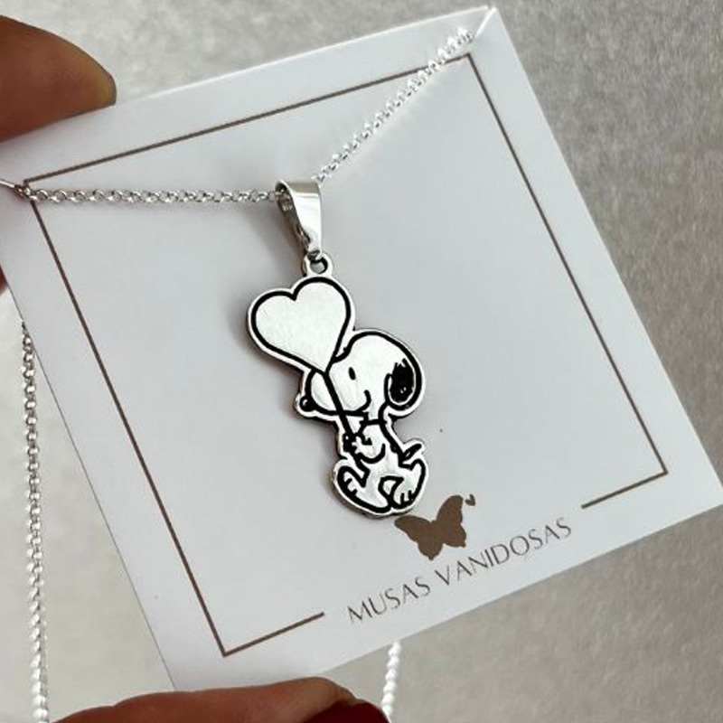 Collar Snoopy Globito elaborado en plata, un diseño tierno y encantador que representa la inocencia, el cariño y la alegría de los pequeños detalles. Snoopy sosteniendo su globito transmite amor y ternura, ideal para regalar a alguien especial. Incluye grabado posterior, perfecto para personalizarlo con un nombre, fecha o mensaje significativo y convertirlo en un recuerdo inolvidable.